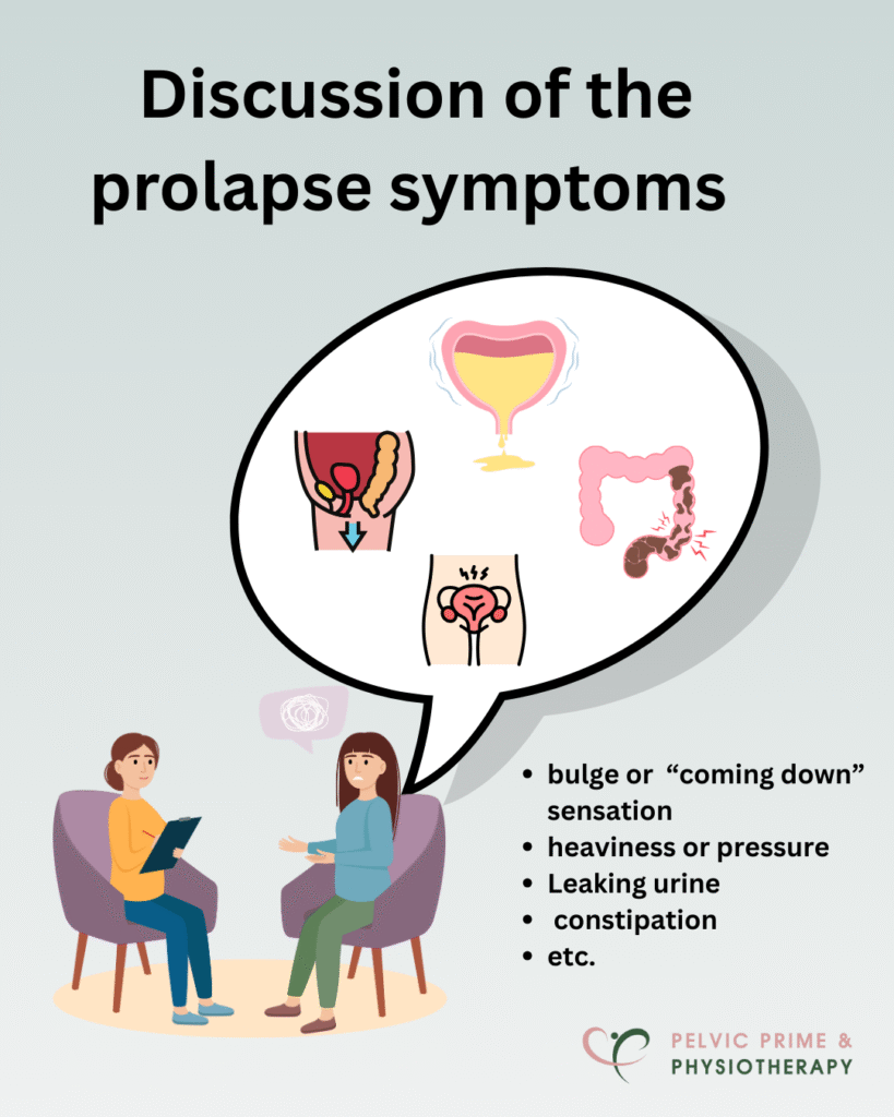 prolapse-related symptoms, such as bulging or a ‘coming down’ sensation, heaviness or pressure, urine leakage, constipation, and more.