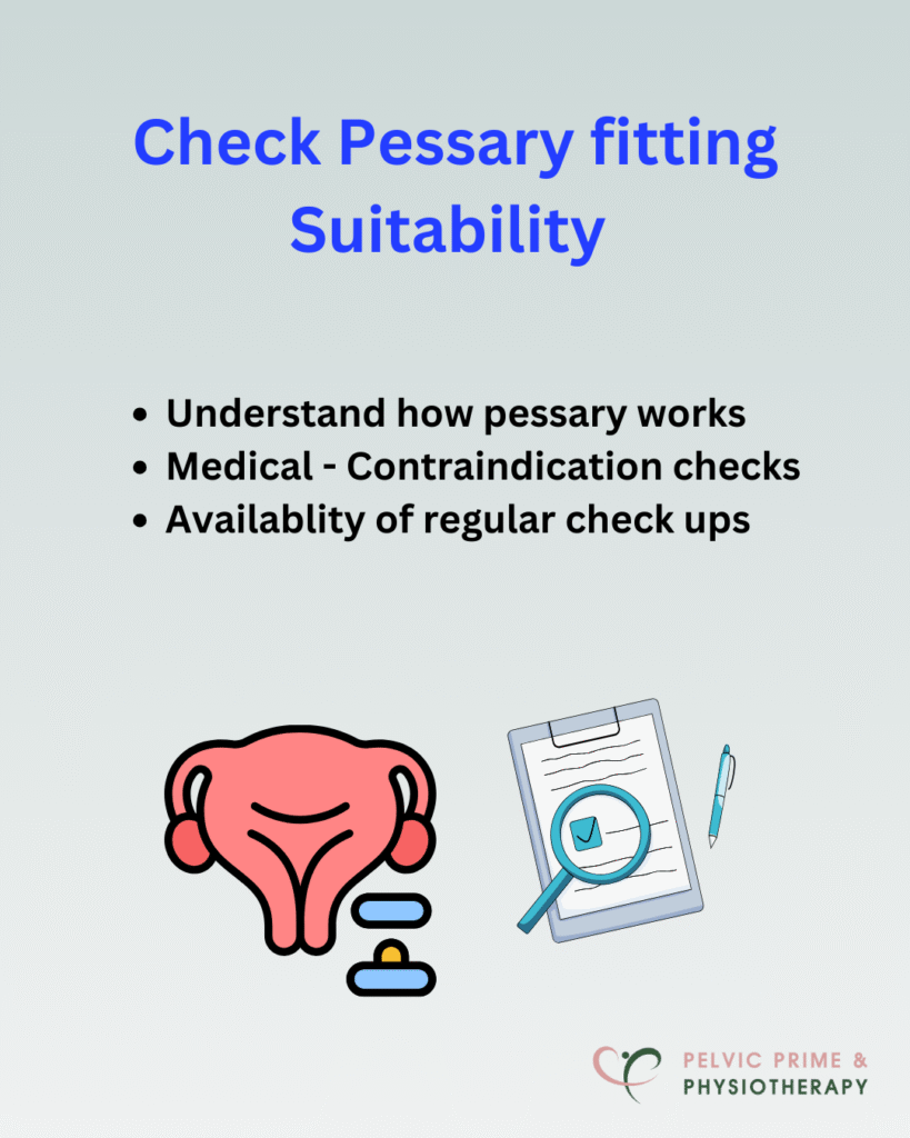 This includes checking whether you understand how a pessary works, whether you have any contraindications for using a pessary, and whether you’re able to attend regular follow-up appointments