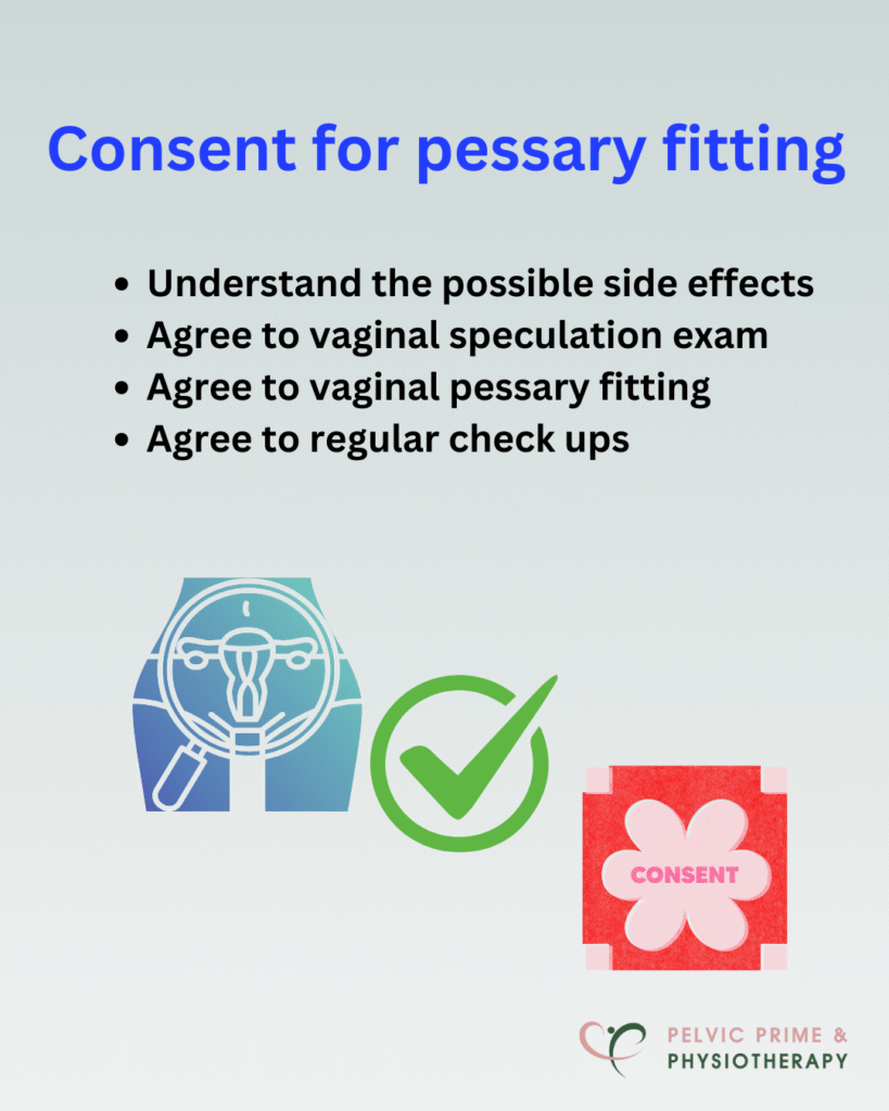 This includes understanding the possible side effects, agreeing to a vaginal speculum exam, the pessary fitting itself, and regular follow-up check-ups